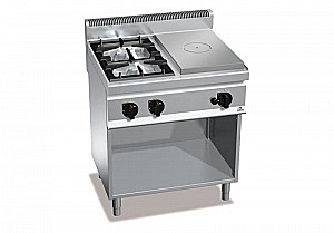 Рабочая поверхность и фронтальные панели из нержавеющей стали AISI 304. Плита со сплошной поверхностью из стали большой толщины, обладающая повышенной прочностью и дифференцированным распределением тепла по термическим зонам: максимальная температура в центре и убывающая по направлению к краям. Центральная горелка на 7 КВт с оптимизированным сгоранием, включаемая с помощью крана с предохранительным клапаном, оснащенным термопарой, с защищенным пилотным индикатором. Пьезоэлектрический поджиг с защитой из силикона. Горелки высокой мощности с открытым огнем полностью из никелированной стали с одинарным и двойным ободом, оснащенные пилотным огнем, с пожизненной гарантией, включаемые с помощью крана с предохранительным клапаном, оснащенным термопарой, с защищенным пилотным индикатором. Чугунные решетки. Максимальная чистота в обслуживании гарантирована полной съемностью как корпуса горелки, так и контейнеров для огня. Регулируемые ножки.