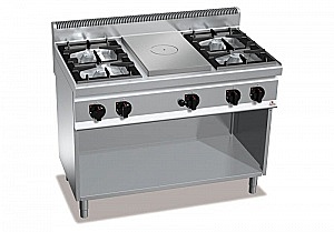 Рабочая поверхность и фронтальные панели из нержавеющей стали AISI 304. Плита со сплошной поверхностью из стали большой толщины, обладающая повышенной прочностью и дифференцированным распределением тепла по термическим зонам: максимальная температура в центре и убывающая по направлению к краям. Центральная горелка на 7 КВт с оптимизированным сгоранием, включаемая с помощью крана с предохранительным клапаном, оснащенным термопарой, с защищенным пилотным индикатором. Пьезоэлектрический поджиг с защитой из силикона. Горелки высокой мощности с открытым огнем полностью из никелированной стали с одинарным и двойным ободом, оснащенные пилотным огнем, с пожизненной гарантией, включаемые с помощью крана с предохранительным клапаном, оснащенным термопарой, с защищенным пилотным индикатором. Чугунные решетки.Максимальная чистота в обслуживании гарантирована полной съемностью как корпуса горелки, так и контейнеров для огня. Регулируемые ножки.
