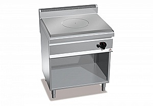 Рабочая поверхность и фронтальные панели из нержавеющей стали AISI 304. Чугунная конфорка крупных размеров большой толщины, обладающая повышенной прочностью и дифференцированным распределением тепла по термическим зонам: максимальная температура в центре и убывающая по направлению к краям. Центральная горелка 13 кВт с оптимизированным сгоранием, включаемая с помощью крана с предохранительным клапаном, оснащенным термопарой, с пилотным индикатором. Пьезоэлектрический поджиг с защитой из силикона и отделкой камеры сгорания вермикулитом, материалом, обладающим высокими изоляционными свойствами. Регулируемые ножки.