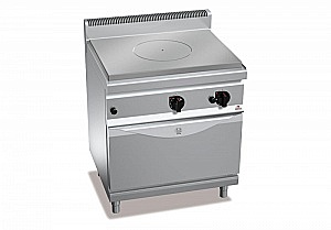 Рабочая поверхность и фронтальные панели из нержавеющей стали AISI 304. Чугунная конфорка крупных размеров большой толщины, обладающая повышенной прочностью и дифференцированным распределением тепла по термическим зонам: максимальная температура в центре и убывающая по направлению к краям. Центральные горелки 13КВт с оптимизированным сгоранием, включаемые с помощью крана с предохранительным клапаном, оснащенным термопарой, с пилотным индикатором. Пьезоэлектрический поджиг с защитой из силикона и отделкой камеры сгорания вермикулитом, материалом, обладающим высокими изоляционными свойствами. Духовой шкаф с пилотным огнем, полностью изготовленная из нержавеющей стали, с направляющими 4 уровней для решеток и противней 2/1GN. Горелка духового шкафа с самостабилизирующимся огнем и термостатом, регулирующим температуру от 160°C до 280°C. Штампованная передняя дверца без прокладок для лучшей изоляции и легкости чистки. Штампованные дверь и контрдверь из нержавеющей стали AISI 304. Ручка двери из высокопрочной стали AISI 304 толщиной 20/10. Регулируемые ножки.