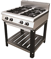 ,4 профессиональные горелки класса Heavy Duty, газовая мощность 27 kW, газ/контроль, 3 горелки по 6.5 кВт, 1 - 9 кВт, подставка полностью разборная c 1 нейтральной полкой, плита и подставка из н/стали, г.нетто 800x800x1050 80кг, г.брутто: 890х890х650, 105кг