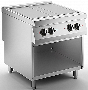 Универсальная электрическая индукционная плита, на открытом основании. Верхняя часть из нержавеющей стали AISI 304 толщиной 20/10, предназначенная для соединения встык, индукционная варочная панель толщиной 6 мм, герметично приваренная к верхней части, система распознавания посуды, которая активирует нагрев в присутствии посуды. Оснащена 4 независимыми конфорками мощностью 7 кВт. Обогреваемые зоны разграничены контурами, нанесенными шелкографией на стекло. Селектор команд, позволяющий использовать 6 уровней мощности. Контрольные лампы, сигнализирующие о включении нагрева и указывающие на правильное функционирование прибора. Встроенный блок питания, основной датчик безопасности. Регулируемые по высоте ножки из нержавеющей стали. Размер рабочей поверхности 750x700 мм