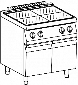 Для приготовления в кастрюлях и сковородках. Электрическая плита изготовленная из нержавеющей стали Aisi. Столешница с приподнятым бортиком для сбора жидкостей. Варочная панель из стали с гладкой хромированной поверхностью. Закругленные углы и скошенный верхний край. Независимые зоны для приготовления пищи. Включение нагрева с помощью термостата с регулируемой температурой поверхности от 50 до 400 °C. Оснащена защитным термостатом и автоматическим сбросом, который уменьшает нагрев в случае использования без сковороды или с неподходящей сковородой. Пол печи из чугуна.