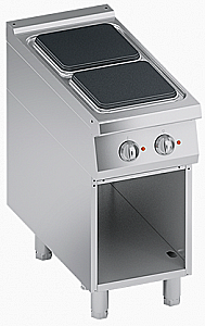 Отопление осуществляется посредством чугунных квадратных электрических плит. Нагревательные элементы закреплены на нижней части пластины, заделанной в слой изоляционного материала. Каждая конфорка оснащена переключателем, позволяющим изменять тепловую мощность от максимальной до минимальной в семи положениях. Безопасность обеспечивается ограничителем температуры, расположенным внутри конфорки.