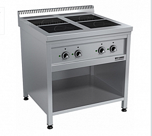 Плита электрическая индукционная напольная, на полузакрытом стенде без дверей (открытом со стороны оператора), оснащена бортом, 4 стеклокерамическими конфорками с независимыми 16-позиционными терморегуляторами.