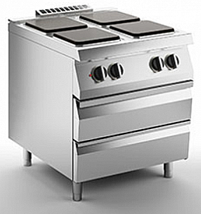 Электрическая плита изготовлена из нержавеющей стали Aisi 304. Толстая прессованная поверхность толщиной 15/10, предназначенная для ровного выравнивания. Утопленная вершина, чтобы содержать пятна. 4 квадратные герметичные конфорки из чугуна с выходной мощностью 2,6 кВт. 7-позиционный селекторный переключатель для регулировки нагрева. Активация нагрева сигнализируется оранжевым индикатором на панели управления.