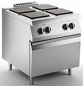 Электрическая плита изготовлена из нержавеющей стали Aisi 304. Толстая прессованная поверхность толщиной 15/10, предназначенная для ровного выравнивания. Утопленная вершина, чтобы содержать пятна. 4 квадратные герметичные конфорки из чугуна с выходной мощностью 2,6 кВт. 7-позиционный селекторный переключатель для регулировки нагрева. Активация нагрева сигнализируется оранжевым индикатором на панели управления.