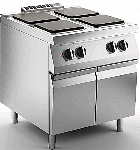Электрическая плита с 4 конфорками, на шкафу. Верхняя часть из прессованной нержавеющей стали (AISI 304), толщина 15/10, предварительно смонтирована для прямого соединения. Верхняя часть с резервуаром для сбора жидкостей. 4 прямоугольные чугунные конфорки мощностью 2,6 кВт каждая, герметично закрытые сверху. Нагрев регулируется с помощью 7-позиционного переключателя. Оранжевая сигнальная лампочка загорается при включении обогрева. Конфорки, оснащенные защитным термостатом с автоматическим возвратом в исходное положение, срабатывают, когда посуда, используемая в приборе, не подходит или ее вообще нет. Сигнальная лампочка показывает, правильно ли работает прибор. Регулируемые по высоте ножки из нержавеющей стали. 3Ф 440В 60Гц