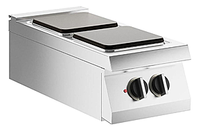 Электрическая варочная панель из нержавеющей стали AISI 304. Прессованная поверхность толщиной 20/10, предварительно подготовленная для прямого подключения и установки водяного столба (принадлежность). Сверху установлена емкость для сбора жидкостей. 2 чугунные квадратные конфорки 30x30 см, мощностью 4 кВт каждая, герметично закрытые сверху. Нагрев устанавливается с помощью 7-позиционного переключателя. При включении обогрева загорается сигнальная лампа оранжевого цвета. Конфорки, оборудованные предохранительным термостатом с автоматическим сбросом, активируются, когда кастрюля, используемая на приборе, не подходит или сковорода совсем отсутствует. Сигнальная лампочка проверяет правильность работы прибора. Регулируемые по высоте ножки.