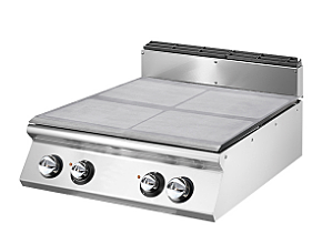 Электрическая твердая поверхность с 4 зонами. Боковые панели, дно и задняя часть выполнены из нержавеющей стали. Столешница изготовлена из AISI 304 20/10. Дымоход изготовлен из эмалированного чугуна. Плита для приготовления пищи изготовлена из стали высокой толщины. 4 зоны приготовления, каждая мощностью 3,4 кВт, отмеченные атласной варочной поверхностью. Предохранительный термостат. Термостатический регулятор для регулировки температуры поверхности от 50 ° C до 400 °C. Лампа для индикации включения нагрева и правильной работы оборудования. Специально разработанные ручки предотвращают попадание воды на панель управления.