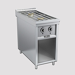 Компактная газовая плита с 2-мя мощными горелками по 6 кВт и съёмной решеткой из нержавеющей стали, позволяющей свободно перемещать посуду по всей ее поверхности. На решетке одновременно размещаются 2 кастрюли объёмом 30 л. В нижней части плиты имеется ниша для хранения кухонного инвентаря. Плита оснащена системой газконтроля и может работать как на природном, так и на сжиженном газе. Корпус изготовлен из высококачественной нержавеющей стали, что значительно облегчает уход за плитой. Герметичная столешница дает возможность производить влажную уборку, исключая попадание жидкости во внутренние полости плиты.