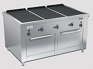 Профессиональная газовая плита с 2-мя духовыми шкафами и 3-мя варочными поверхностями, выполненными из чугуна – материала прекрасно аккумулирующего и долго сохраняющего тепло. Под чугунными настилами располагаются мощные горелки специальной формы, которые быстро и равномерно нагревают всю рабочую зону. Единая ровная поверхность дает возможность готовить несколько блюд одновременно, а также менять интенсивность нагрева путем свободного перемещения посуды по всей плите. Рабочий диапазон температур в жарочном шкафу составляет 110-325 °С, в комплект входят 4 противня из нержавеющей стали размером 530х650х40 мм.