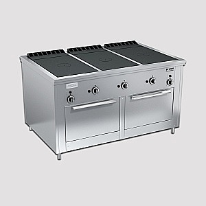 Профессиональная газовая плита с 2-мя духовыми шкафами и 3-мя варочными поверхностями, выполненными из чугуна – материала прекрасно аккумулирующего и долго сохраняющего тепло. Под чугунными настилами располагаются мощные горелки специальной формы, которые быстро и равномерно нагревают всю рабочую зону. Единая ровная поверхность дает возможность готовить несколько блюд одновременно, а также менять интенсивность нагрева путем свободного перемещения посуды по всей плите. Рабочий диапазон температур в жарочном шкафу составляет 110-325 °С, в комплект входят 4 противня из нержавеющей стали размером 530х650х40 мм.