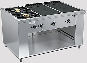 Плита из нержавеющей стали с 2-мя двухрядными горелками и 2-мя варочными чугунными поверхностями. Открытые горелки имеют массивные чугунные решетки размером 430х430 мм, что позволяет размещать на них гастроемкости объемом до 50 л, съёмная подконфорочная емкость. Под чугунными настилами располагаются мощные горелки, быстро и равномерно нагревающие всю поверхность рабочей зоны, благодаря чему на них можно разместить как крупные гастроемкости, так и множество мелких. В нижней части плиты имеется ниша для хранения кухонного инвентаря. Газконтроль, запальные горелки, пьезоподжиг каждой горелки, работа на природном или сжиженном газе. Ножки плиты регулируются по высоте. *Предложение не является публичной офертой. *Изображение на фото, может отличаться от реального.