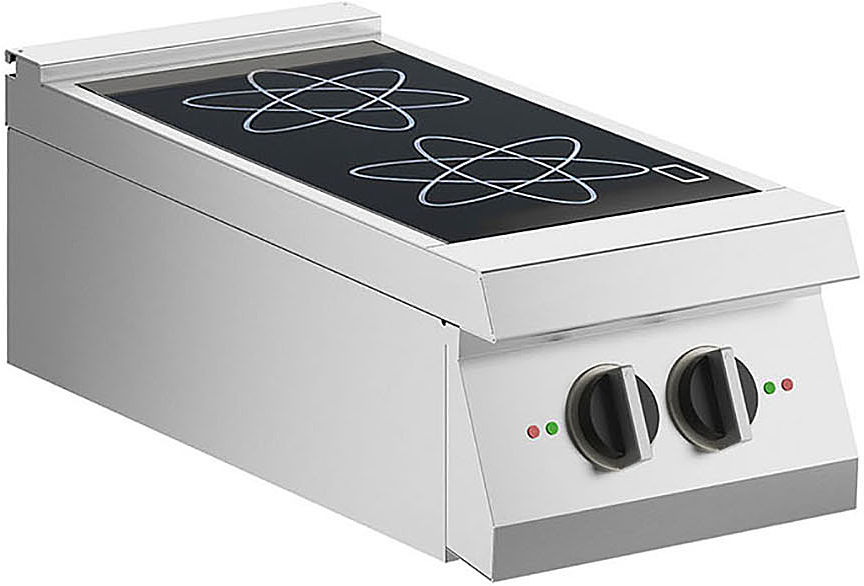 Электрическая индукционная плита. Герметичная стеклокерамическая плита толщиной 6 мм, система обнаружения посуды, которая активирует нагрев при наличии посуды для готовки. Устройство изготовлено из нержавеющей стали AISI 304. Оборудована 2 конфорками мощностью 5 кВт, диам. 280 мм.