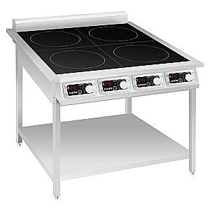 Плита индукционная VIATTO VA-500H4 установлена на открытой подставке со сплошной полкой.