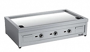 Настольная плита теппан-яки из нержавеющей стали с зеркальной биметаллической поверхностью общей толщиной 35мм, которое защищает продукты от пригорания во время жарки. На поверхности- сливное отверстие для сбора жира, съёмный жиросборник. Широкий диапазон температур каждой из 3-ех независимых зон нагрева позволяет готовить одновременно несколько блюд. Жарочная поверхность: 1096х540мм.