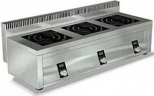 Плита 3х конфорочная плоская, столешница из нержавеющей стали марки AISI 304 толщиной 1,2 мм, корпус из нержавеющей стали марки AISI 430 толщиной 0,8 мм.