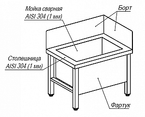 Высота 700 с учетом борт 200), неразборный, борт 200 сзади и справа, одна сварная мойка 560х360х300 в центре, фартук передний, обвязка с трех сторон, столешница – металл AISI 304, профиль 40х40