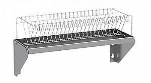 Полка состоит из кассеты для тарелок и поддона. Кассета представляет собой решетку из прутка, в ячейки которой помещаются тарелки. В поддоне предусмотрен небольшой уклон, обеспечивающий сток жидкости, поступающей с мокрой посуды к сливному отверстию.