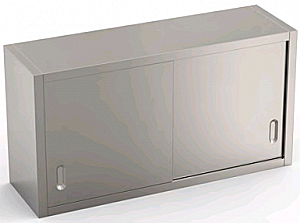 Настенный шкаф с раздвижными дверцами из нержавеющей стали AISI 304. Подвижная промежуточная полка, которую можно расположить на трех разных уровнях, опорную конструкцию необходимо закрепить на стене с помощью прилагаемых монтажных кронштейнов.