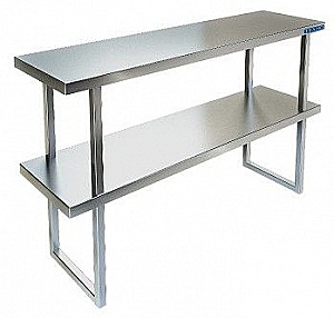 Полка настольная для столов со столешницей ЛДСП разборная из нержавеющей стали марки AISI 430 толщиной 0,8мм, с усилителем, 2 яруса. Боковины (стойки) из трубы 20х20 нержавеющей стали марки AISI 430 толщиной 1,2мм. Крепление к столу болтовое через отверстие в столешнице. Полка поставляется в разобранном виде