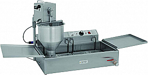 Аппарат пончиковый полуавтоматический, с 1 ванной и автоматическим делителем-дозатором используется на предприятиях общественного питания и торговли для формирования и приготовления в разогретом масле (фритюре) пончиков. Аппарат пончиковый имеет тот же механизм дозирования, что и полностью автоматическое пончиковое оборудование. Главное отличие полуавтомата состоит в отсутствии механизма переворота и выгрузки пончиков - эти операции совершаются вручную. Полуавтомат имеет минимум элементов управления, для работы с ним не требуется особых навыков. Небольшие габариты и малый вес позволяют удобно разместить полуавтомат на столе стандартного размера. Пончиковый аппарат оснащен плунжерной парой, позволяющей изготавливать пончики массой - 20-40г. Максимальная производительность пончиков:дрожжевых - 300шт./ч, смесевых - 300шт./ч. Вместимость фритюрной ванны -12л. Время разогрева не более 20 минут. Вместимость делителя-дозатора - 7л. Пончиковый аппарат изготовлен из высококачественной нержавеющей стали, делитель-дозатор из пищевого алюминиевого сплава. Поддон для выгрузки пончиков в комплект не входит. Для приготовления пончиков другого диаметра необходимо дополнительно приобрести сменную плунжерную пару требуемого диаметра (плунжер и втулку по отдельности).