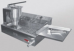 Аппарат для производства пончиков представляет собой комбинацию фиксированного механического (ручного) делителя-дозатора и настольной электрической фритюрницы для приготовления пончиков.