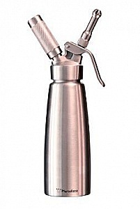 нержавеющая сталь; данный сифон предназначен для разнообразных продуктов, в том числе сливок высокой и низкой жирности. Кроме того он подходит для взбивания десертов, муссов, горячих и холодных соусов, крем-супов и т.д. Благодаря особой двойной колбе он сохраняет горячие продукты горячими, а холодные – холодными до нескольких часов. К его основным свойствам относятся: возможность мыть сифон в посудомоечной машине; колба с двойными стенками, максимизирующая термо-эффект; подходит как для горячих, так и для холодных продуктов; снабжен колбой из нержавеющей стали и металлической головкой, а также снабжен зафиксированной металлическим клапаном в головной части; пластиковая прокладка исключительно устойчива к высоким и низким температурам; яркая насадка с металлической основой, рычаг также выделен при помощи яркой пластиковой вставки; хромированный держатель для баллончиков и крышка от пыли.