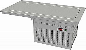 Поверхность охлаждаемая, среднетемпературная, встраиваемая имеет рабочую поверхность из нержавеющей стали. Рабочая температура поверхности: 0/+4С (при температуре окружающей среды +25С и относительной влажности воздуха 60%). Холодильный агрегат располагается под столешницей. Фреон - R404a. Размер отверстия для врезки - 978х578мм. Оборудование предназначено для кратковременного хранения, демонстрации и раздачи холодных закусок, охлажденных продуктов и напитков выложенных в таре; используется на предприятиях общественного питания в составе технологических линий самообслуживания типа шведского стола. На охлаждаемой поверхности образуется «снежная шубка», высота которой колеблется от 5мм до 15мм, в зависимости от температуры в помещении и влажности. «Снежная шубка» придает выложенному продукту особую пикантность и красоту.