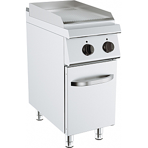 Гриль-сковорода электрическая напольная Epicur-Kusina G7I 110E, на закрытом стенде с 1 распашной дверью, оснащена рифлёной стальной (ST 52) поверхностью с 1 зоной нагрева, бортиком с 3-х сторон толщиной 3мм, вместительным жиросборником. Толщина стали рабочей поверхности - 15мм.