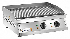 Жарочная поверхность оснащена двумя пакетным переключателями, у которых предусмотрена независимая регулировка температуры от 0 до 300 °C для двух рабочих зон аппарата. Это дает возможность готовить разные блюда одновременно. Наличие борта по периметру поверхности позволяет предотвратить разбрызгивание жира при приготовлении блюд. Удобная емкость для сбора жира расположена по всей ширине аппарата.