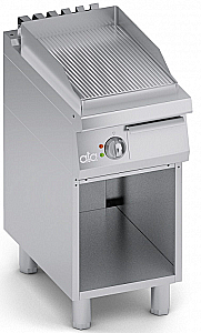 Утолщенная поверхность из нержавеющей стали. Две разные зоны приготовления, каждая из которых оснащена регулятором температуры. Желобчатая плита.