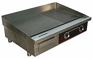 Аппарат имеет одну рабочую поверхность, которая делится на 2 части: две трети занимает гладкая поверхность и одну треть рифленая. Это дает возможность готовить два разных блюда одновременно и существенно расширить возможности его приготовления. Рабочая температура поддерживается терморегулятором автоматически. Наличие защитного борта по периметру аппарата позволяет предотвратить разбрызгивание жира при приготовлении блюд. На лицевой панели расположен лоток для сбора масла и жира. Все элементы конструкции изготовлены из высококачественной нержавеющей стали.