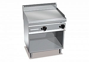 Рабочая поверхность и фронтальные панели из нержавеющей стали AISI 304. Трубчатые горелки с самостабилизирующимся огнем большой площади для большей однородности распределения жара. Регулировка мощности производится постоянно работающим краном. Пилотный огонь и предохранительный клапан, оснащенный термопарой. Пьезоэлектрический поджиг с силиконовой защитой. Максимальная температура более 300°C. Гладкая конфорка из сатинированной стали с проволочной защитой от брызг. Две зоны с отдельными панелями управления и приводом для независимой регулировки и достижения оптимальной температуры. Слегка наклоненная варочная поверхность с крупным сливным отверстием и транспортер в герметично удерживающем жидкости контейнере. Регулируемые ножки.
