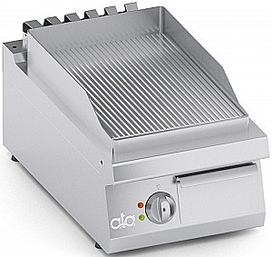 Рабочей поверхности из нержавеющей стали наклонена к сливу жира, который соединен с большим погружным лотком под поверхностью варочной поверхности. Оснащен ящиком для отвода жира.