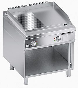 Большая жарочная поверхность: ½ гладкая ½ рифленая из мягкой стали . Она обеспечивает отличную передачу тепла и слегка наклонена, чтобы обеспечить отток жира в сторону слива.
