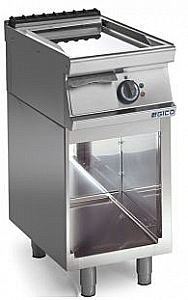 Гриль-сковорода электрическая на полузакрытом (открытом со стороны оператора) стенде оснащена гладкой стальной рабочей поверхностью с 1 зоной нагрева, с бортом с трех сторон, термостатом.