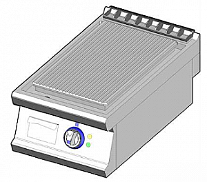 Гриль-сковорода электрическая настольная оснащена рифленой стальной рабочей поверхностью с 1 зоной нагрева, с бортом с трех сторон, термостатом.