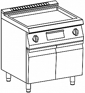Жарочная поверхность изготовлена из нержавеющей стали Aisi. Оснащена независимыми конфорками с наклонной решеткой. Опущенная жарочная поверхность, герметично закрытая по отношению к столешнице. Передний жироуловитель для легкой очистки – жир хранится в специальном ящике на панели управления. Регулируемая температура от 110° до 280°, в зависимости от версии. Обогревом за счет усиленных ТЭНов.