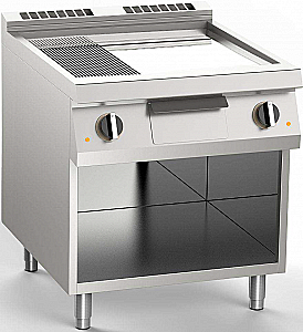 Электрическая жарочная поверхность, две конфорки с 2/3 гладкой и 1/3 ребристой, наклонной и хромированной конфоркой, моноблок на открытом основании. Варочная панель из нержавеющей стали AISI 304, толщина 15/10, с возможностью прямого соединения. Плита ниже на 4 см по сравнению со столешницей, герметизирована и приварена для облегчения очистки. Варочная поверхность с глянцевым покрытием, зона охлаждения 6,5 см в передней части конфорки. Круглое отверстие для слива жира, диам. 4 см. Поддон для жира емкостью 2,5 л. Нагрев с помощью экранированных электрических сопротивлений INCOLOY. При включении обогрева загорается сигнальная лампа на панели управления. Проверка температуры приготовления происходит термостатически в диапазоне температур от 110 ° до 280 ° C. Если рабочий термостат вызывает проблемы, включается предохранительный термостат. Варочная поверхность 73,5х53 см. Регулируемые по высоте ножки из нержавеющей стали. Скребок для плиты прилагается.