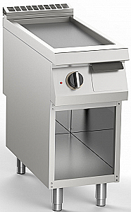 Электрическая жарочная поверхность с одной конфоркой, с ребристой наклонной поверхностью, изготовленная из нержавеющей стали Aisi 304. Верхняя часть из нержавеющей стали толщиной 20/10. Конфорка утоплена на 40 мм по сравнению со столешницей, цельносварная конструкция обеспечивает простоту очистки. Сатинированная варочная поверхность с зоной охлаждения 65 мм на передней стороне конфорки. Круглое сливное отверстие для жира диам. 40 мм. Емкость для сбора жира объемом 1,5 литра. Нагрев с помощью бронированных нагревательных элементов из инколоя. Включение нагрева сигнализируется светодиодом на панели управления. Температура приготовления контролируется термостатом с регулировкой от 110 до 280 °C. Защитный термостат срабатывает в случае неисправности рабочего термостата. Размер рабочей поверхности 345 x 700 см. Открытое дно 400 мм. Регулируемые по высоте ножки из нержавеющей стали. Скребок для конфорки в комплекте.