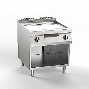 Электрическая жарочная поверхность, две конфорки с гладкой наклонной хромированной поверхностью, моноблок на открытом основании.Жарочная панель изготовлена из нержавеющей стали AISI 304, толщиной 20/10, предварительно приспособлена для прямого соединения. Конфорка опущена на 4 см по сравнению со столешницей, герметична и приварена для облегчения чистки. Сатинированная варочная поверхность, зона охлаждения 6,5 см в передней части конфорки. Круглое отверстия для слива жира, диам. 4 см. Поддон для жира емкостью 2,5 л. Нагрев с помощью экранированных электрических резисторов INCOLOY. При включении обогрева на панели управления загорается сигнальная лампочка. Проверка температуры приготовления происходит термостатически в диапазоне температур от 110° до 280°C. Если при работе термостата возникают проблемы, включается предохранительный термостат. Жарочная поверхность 74.5x70 см. Регулируемые по высоте ножки из нержавеющей стали. Скребок для плиты в комплекте.