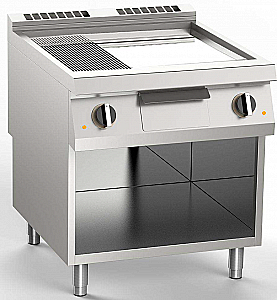 Электрическая жарочная поверхность, две зоны приготовления с 2/3 гладкой и 1/3 ребристой поверхностью, наклонная и хромированная конфорка, моноблок на открытом основании. Варочная панель изготовлена из нержавеющей стали AISI 304, толщина 20/10, предварительно смонтирована для прямого соединения. Плита, опущенная на 4 см по сравнению со столешницей, герметизирована и приварена для удобства чистки. Поверхность для приготовления пищи с матовым покрытием, зона охлаждения 6,5 см в передней части конфорки. Круглое отверстие для слива жира, диам. 4 см. Поддон для жира емкостью 2,5 литра. Нагрев с помощью экранированных электрических сопротивлений INCOLOY. При включении обогрева загорается сигнальная лампочка на панели управления. Проверка температуры приготовления осуществляется термостатически в диапазоне температур от 110° до 280 °C. В случае возникновения проблем с работающим термостатом включается предохранительный термостат. Варочная поверхность 74,5х70 см. Регулируемые по высоте ножки из нержавеющей стали. Скребок в комплект поставки.