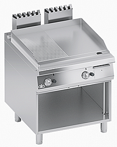 U-образная горелка с оптимизированным сгоранием и предохранительным газовым краном с термопарой и пилотным пламенем; позволяет регулировать пламя от максимума до минимума. 2 независимые рабочие пластины шириной 800 мм.