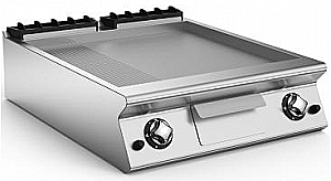 С двумя варочными зонами с наклонной конфоркой 2/3 гладкой, 1/3 ребристой, выполненной из нержавеющей стали AISI 304.