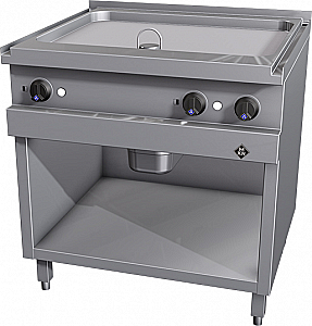Панель управления с профилем для защиты элементов управления, снимается для удобного и менее затратного сервисного обслуживания. Втопленная поверхность за выключателями,которые имеют эргономичную форму, для более четкой фиксации положения Сковорода с большими радиусами угла для легкой мойки, углублена в столешницу, метод бесшовной сварки. Две регулируемые зоны нагрева. Закрываемое сливное отверстие в дне ,внизу емкость для сбора жира