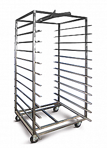 Тележка для ротационной печи предназначена для транспортировки в кондитерских, пекарнях, булочных и супермаркетах с собственным производством хлебных и кондитерских заготовок для их расстойки и выпечки.