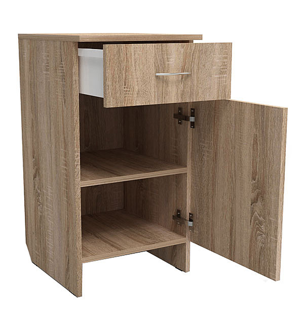 Тумбочка армейская на 2 человека. В верхней части комплектуется ящиком-метабоксом с перегородкой на две секции. Нижняя часть тумбочки имеет дверцу, за которой расположена полка. Изделие сборно-разборной конструкции. Сборка – на шкантах, винтах-стяжках с декоративными заглушками. Крепление крышки тумбочки осуществляется на стяжках типа «минификс». В изделии применяются четырехшарнирные петли с фиксатором и углом открытия 95о, металлические полкодержатели. Тумбочка изготавливается из древесно-стружечной плиты, облицованной пленками на основе термореактивных полимеров. Задняя стенка – из древесно-волокнистой плиты. Крепление задней стенки производится шурупами. Все лицевые и несопрягаемые кромки облицовываются кромочным материалом ПВХ.
