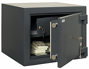 Сейф офисный взломостойкий ПК - 53 сертифицирован по 1 классу взломостойкости. Сейф имеет двойные стенки, пространство между которыми заполнено специальным наполнителем. Наружная дверь металлического сейфа оборудована поворотным ригельным подпружиненным механизмом, который приводится в действие поворотной рукояткой. Благодаря наличию четырех противоположно направленных горизонтальных и двух вертикальных активных ригелей отсутствует возможность вскрытия сейфа методом воздействия на петли. Ригели, диаметром 30 мм, изготовлены из закаленной стали. Сейф имеет хромированные ригели и фурнитуру. Предусмотрена возможность крепления сейфа к полу. Сейф оборудован 1 полкой.